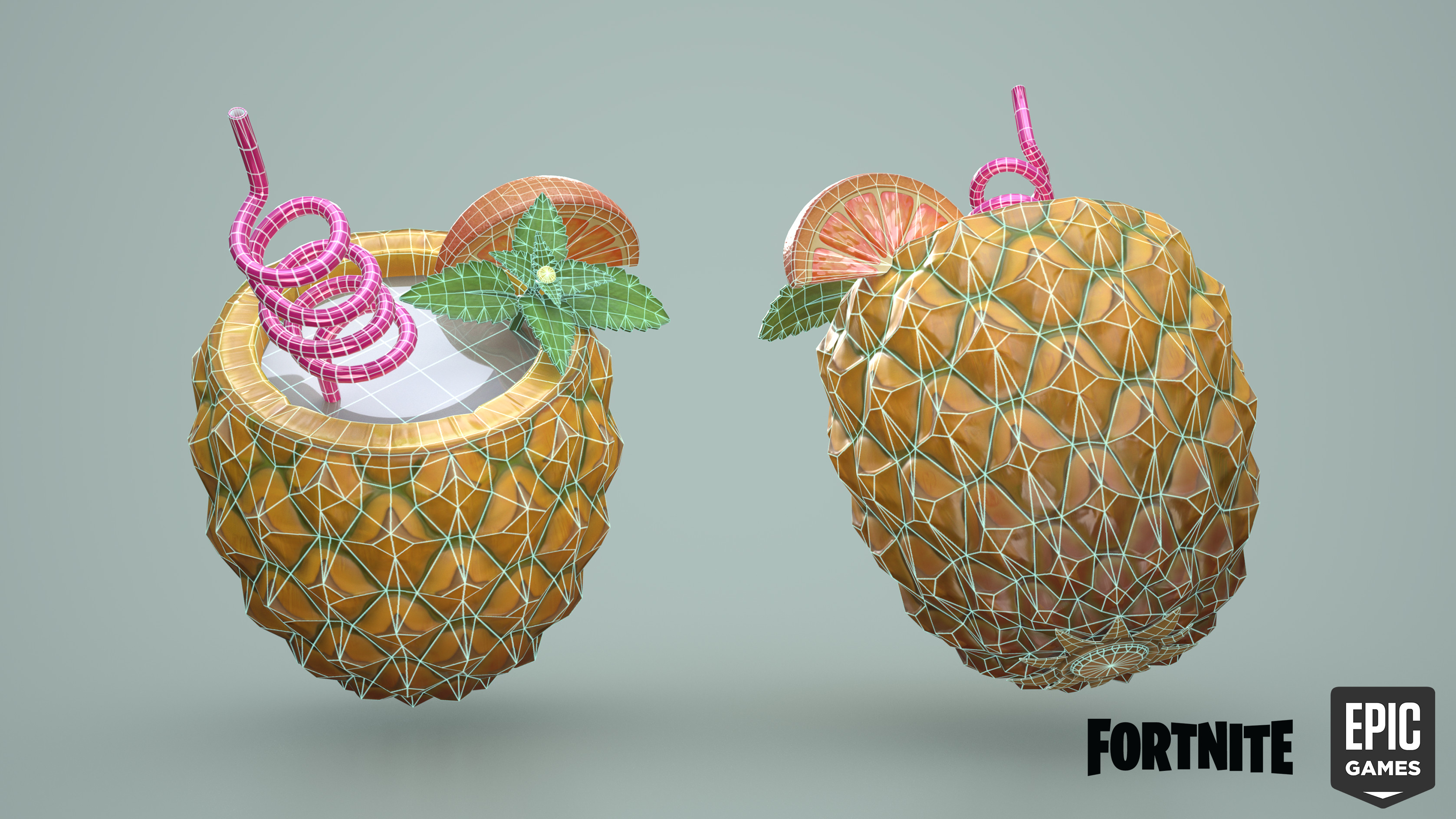 This backbling was in the battlepass with a lion character so this is meant to be a pineapple with milk in it with a catnip garnish. Gross, but maybe not to a cat. This pineapple was a fun challenge to work on! Balancing the amount of pineapple detail with the stylization took quite a bit of iteration, but eventually we got there. I was responsible for HP, LP, bakes, and paint (and implementation).